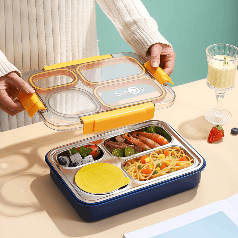 1. This multi-compartment stainless steel lunch box is perfect for keeping your main course, sides, and snacks neatly separated in one sleek container.